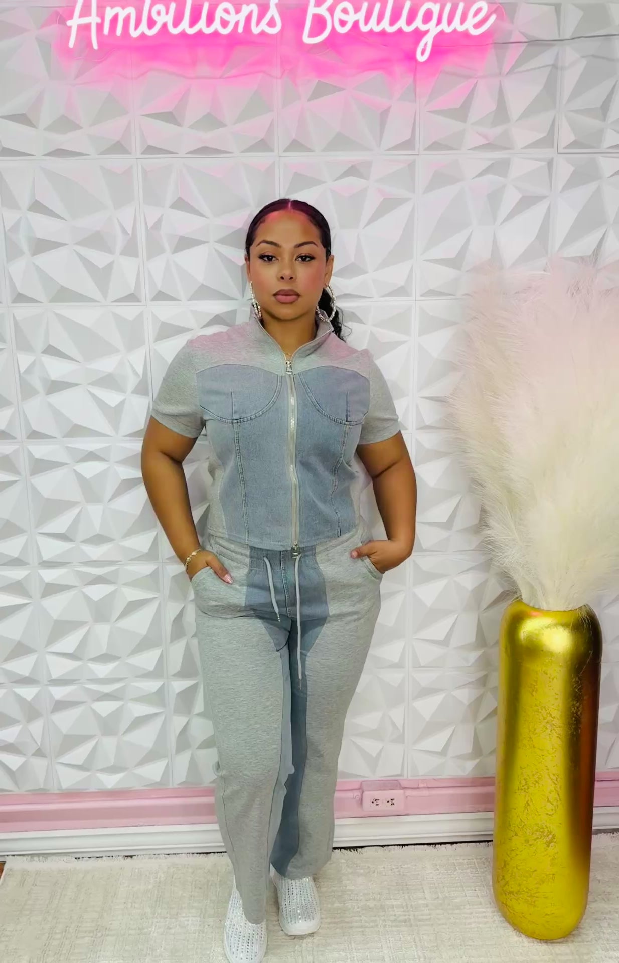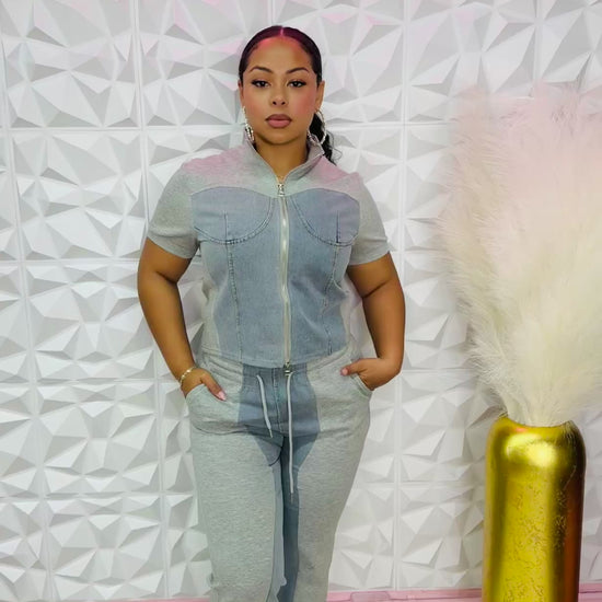 This outfit is a two-piece set combining casual comfort with a denim-inspired twist